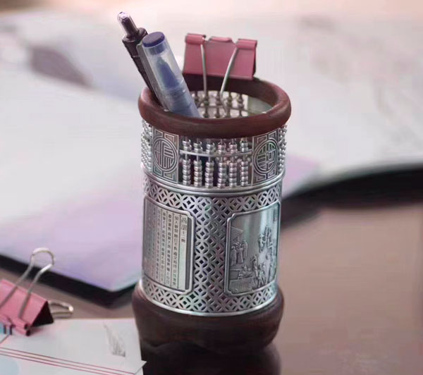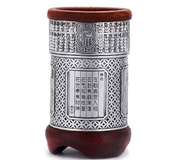 纯银笔筒999足银摆件红酸枝木
